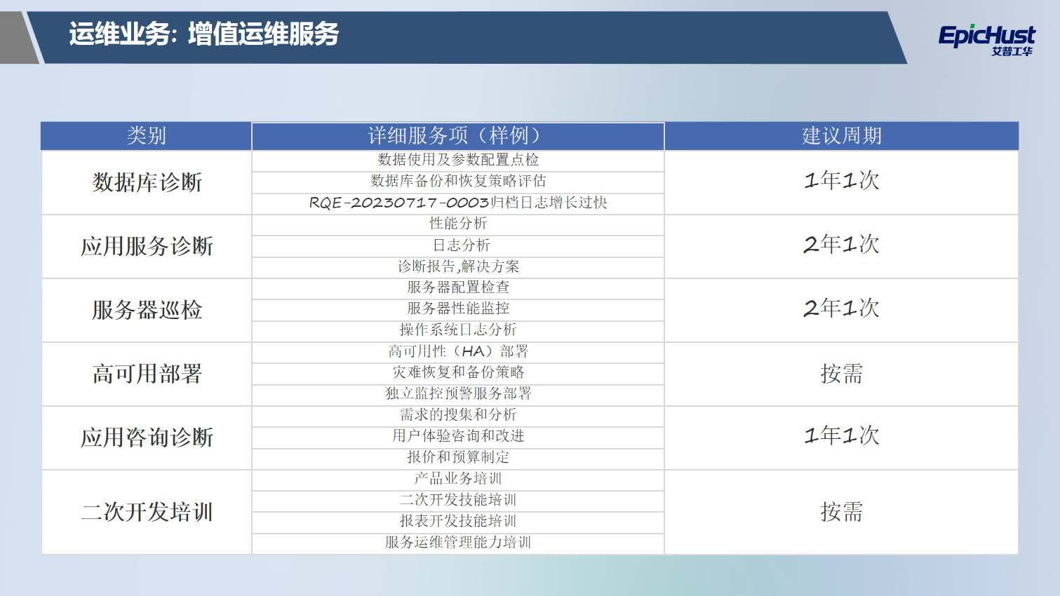 在產(chǎn)品運(yùn)維基礎(chǔ)上,我們進(jìn)一步提供增值運(yùn)維服務(wù),包括但不限于數(shù)據(jù)庫(kù)診斷、應(yīng)用服務(wù)診斷、服務(wù)器巡檢、高可用部署、應(yīng)用咨詢?cè)\斷和二次開發(fā)培訓(xùn)。通過(guò)深入的問(wèn)題診斷、細(xì)致的日常巡檢、專業(yè)的性能優(yōu)化和定制化的功能補(bǔ)充,我們更有力地預(yù)防和解決異常情況,從而進(jìn)一步提升系統(tǒng)的穩(wěn)定性和可用性,為您的業(yè)務(wù)運(yùn)行提供更全面、更高效的保障。