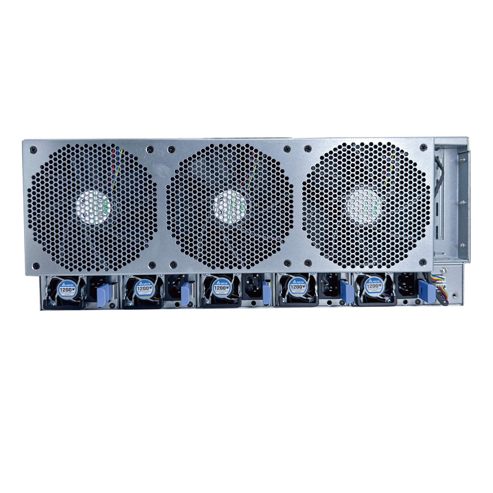 平臺(tái)采用最新GEN5.0,MCIOx8接口,最大保證GPU跟CPU之間通訊損耗降到最低,發(fā)揮顯卡的性能。供電支持5個(gè)CRPS,工作模式3+2,最大負(fù)載支持8000瓦特,結(jié)合XT90(航空頭)端子引線方式,大大滿足GPU的高功耗供電需求。