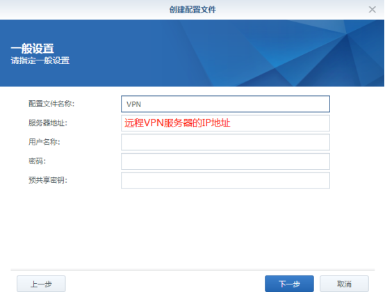 4. Enter the name of the configuration file (optional), the IP address of the remote VPN server, the user password, and the pre-shared key.